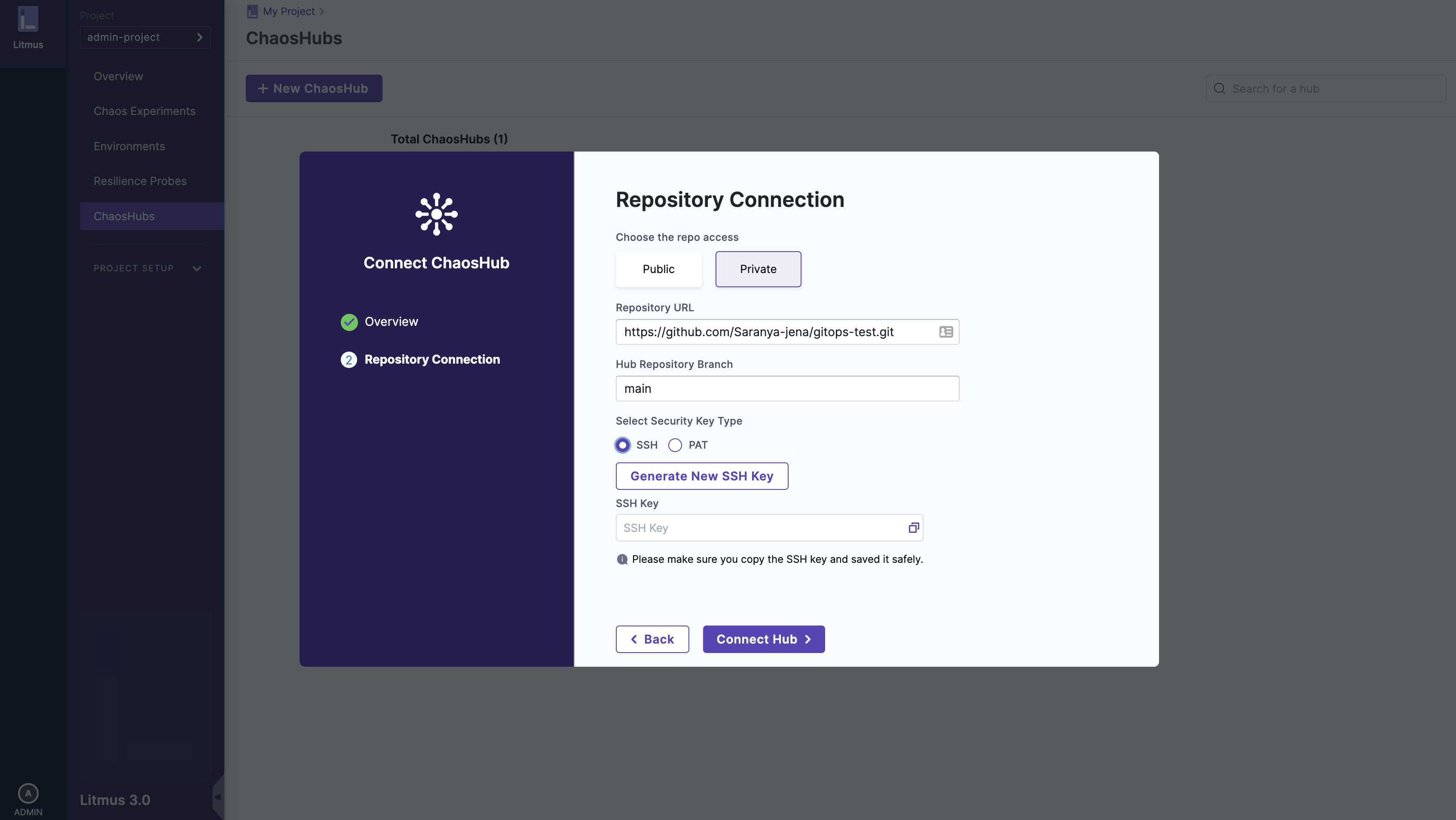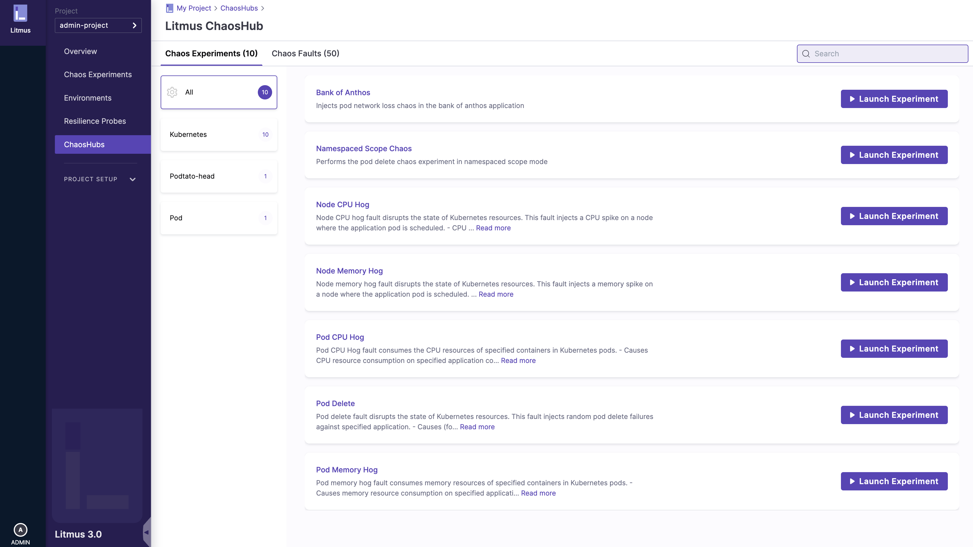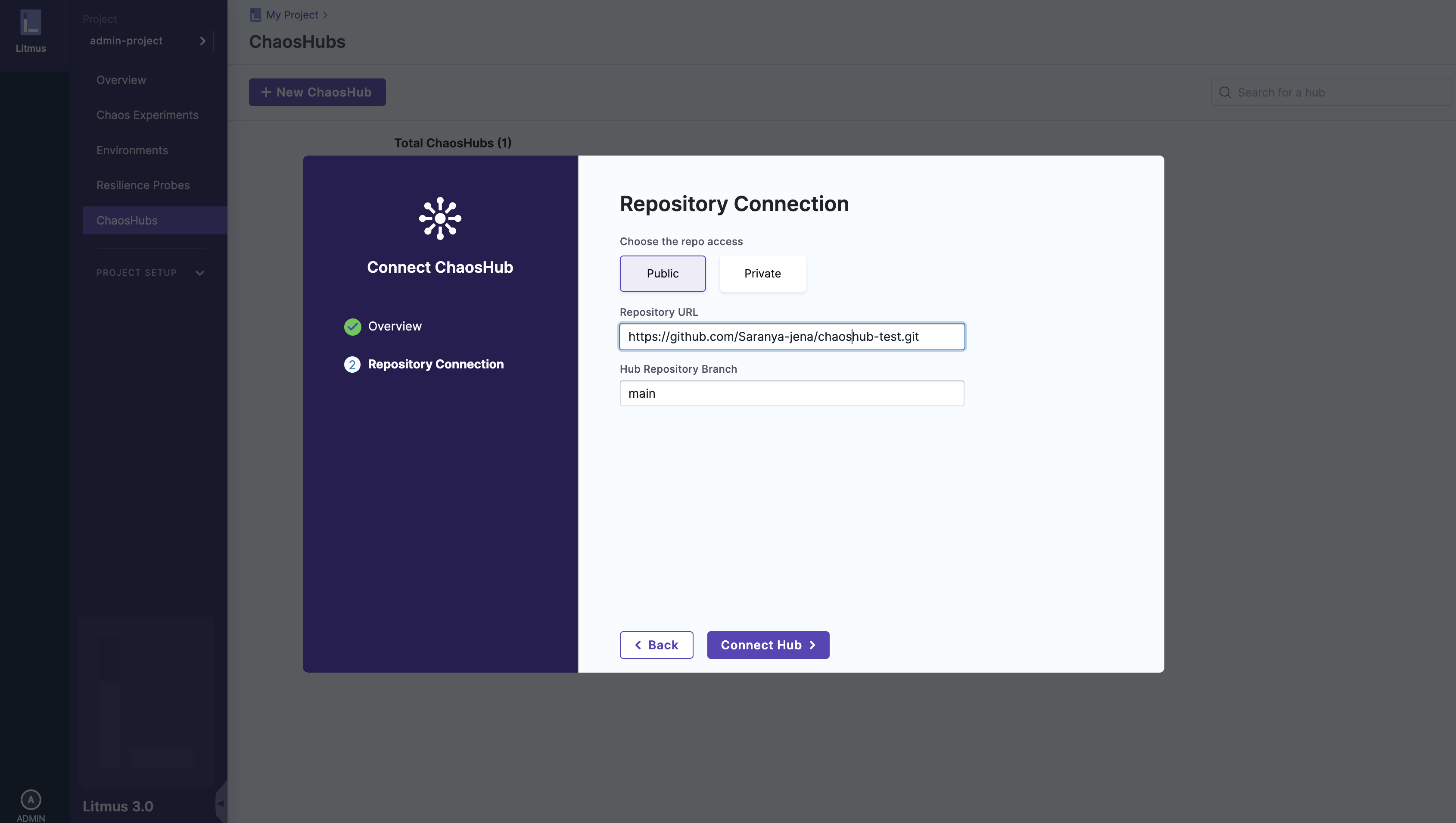 - Chaos experiments can be created from the public ChaosHub which is already connected to your ChaosCenter, or a custom ChaosHub which is a fork of the public ChaosHub where custom faults can be stored.
